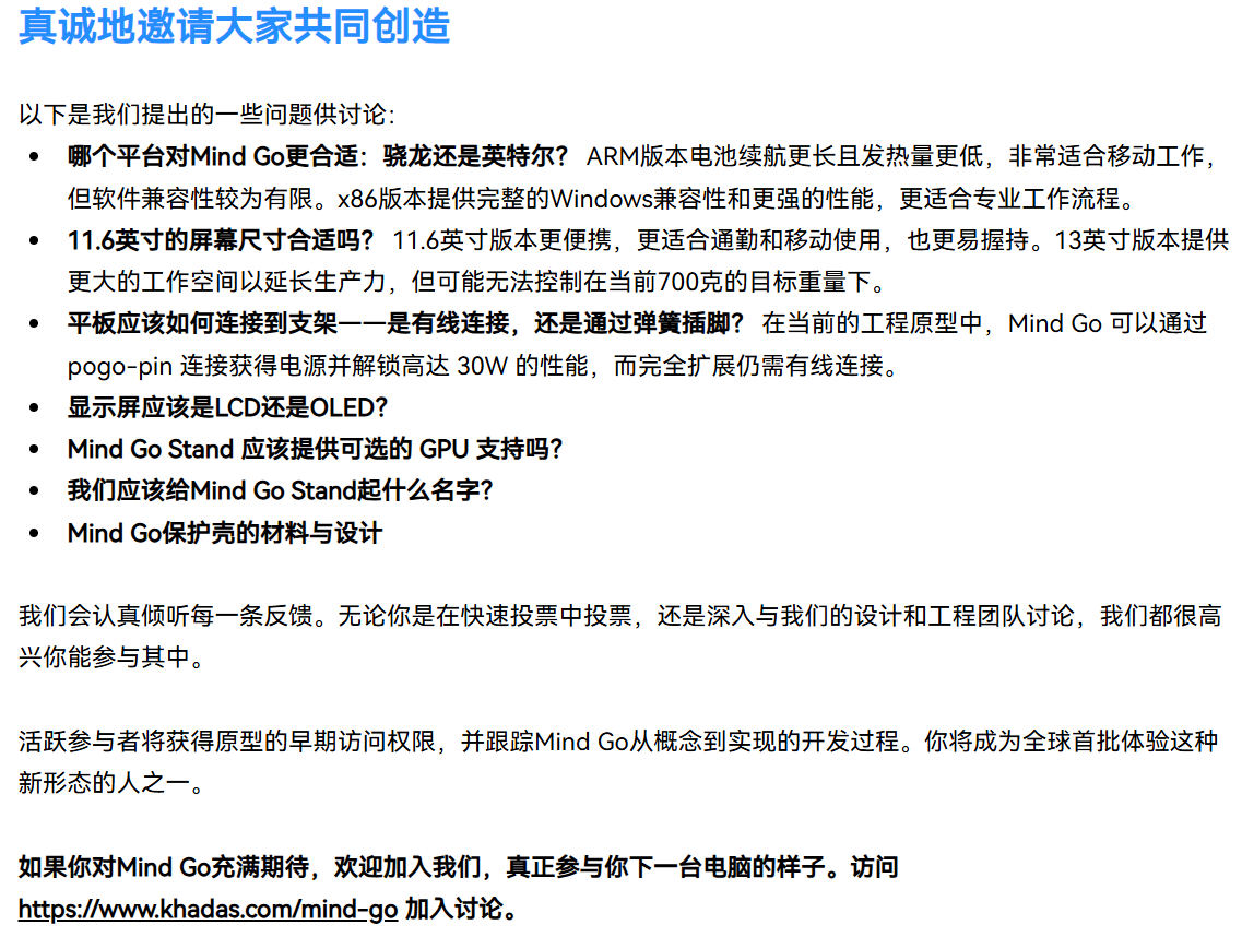 目前Mind Go处于早期开发阶段,Khadas正在处理器平台选型、屏幕尺寸及面板类型等问题上公开征集用户意见,这也意味着产品最终形态或将结合市场反馈进一步优化调整,值得持续关注。