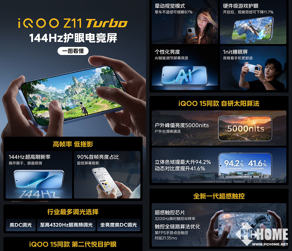 iQOO手机官方再次曝出新机猛料,iQOO Z11 Turbo采用144Hz护眼电竞屏,不仅做到了高帧率、低拖影,还拥有行业最多的调光选择。