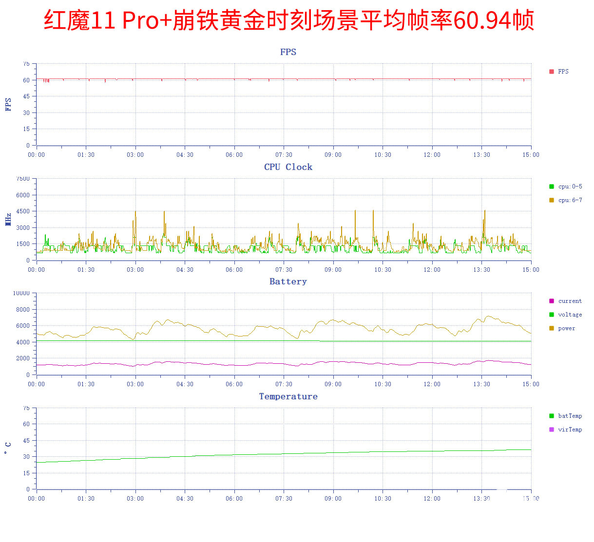 在《崩坏:星穹铁道》黄金时刻场景跑图测试中,开启超高分辨率设置后,平均帧率达 60.94 帧,帧率曲线近乎一条直线;1% LOW 帧为 58.51 帧,与平均帧率高度接近,几乎无明显波动。5.59W 的平均功耗,也彰显了第五代骁龙 8 至尊版的高能效,在双主动散热加持下,整机最高温度未超过 38℃。