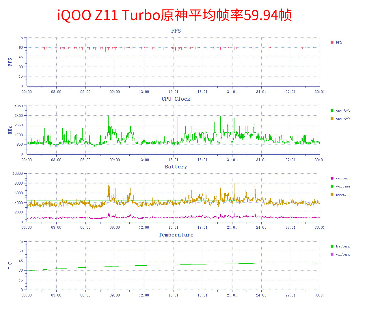 iQOO Z11 Turbo搭载 Monster 超核引擎进行性能调度,针对第五代骁龙 8 的硬件特性进行专属调校,《原神》30 分钟实测中,平均帧率 59.94 帧,平均功耗 4.07W,机身温度 41.8℃,帧率表现稳定且支持超分 + 超帧功能。