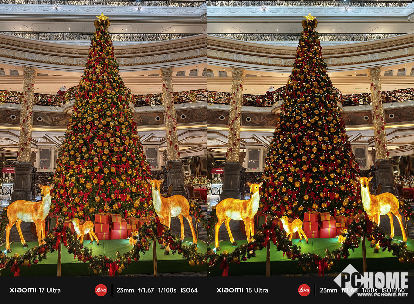 在光线更复杂的场景中,小米17 Ultra的模型鹿不过曝,圣诞树的颜色呈现出自然的绿色效果,与视觉所见别无二致。