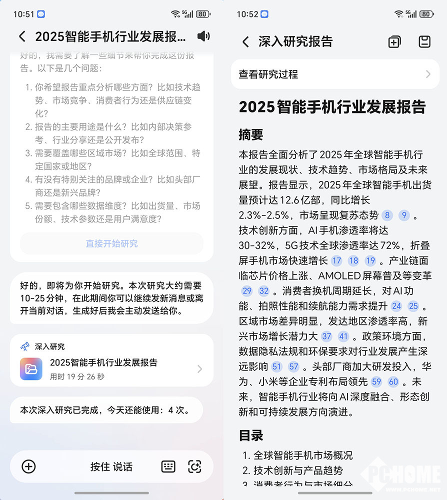 除影像领域外,荣耀 Magic8 系列的 YOYO 智能体还有诸多实用玩法。一键深度研究功能实用性拉满,只需用一句话提出需求与想法,YOYO 便能整理出详尽程度堪比专业研究报告的分析内容。对于需要查询大量市场数据的用户而言,该功能可直接提供行业数据,甚至能基于数据给出专业行业结论。