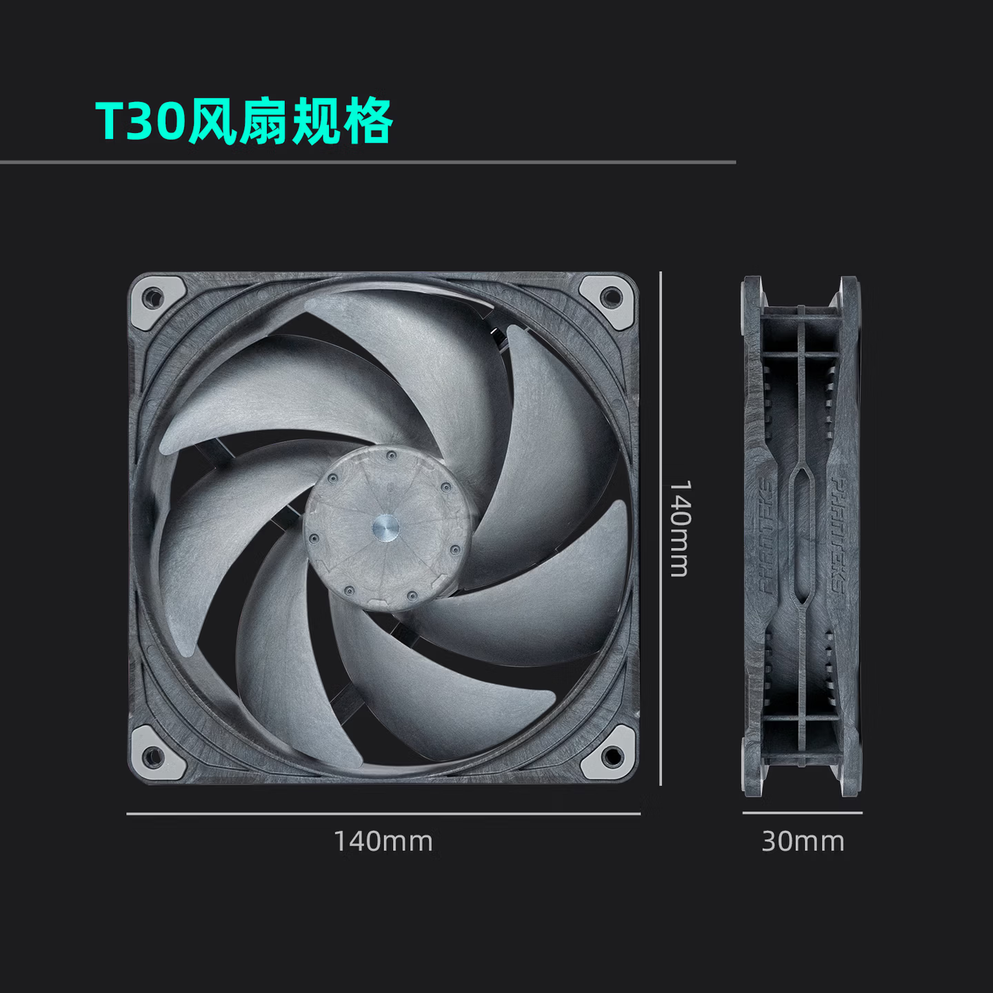 作为T30系列的延伸款,T30-140采用差异化的140×140×30mm加厚规格,进一步优化扇叶倾角设计,通过增大气流推力实现风压与风量的双重突破。拥有超过主流竞品的性能表现,能够穿透高密度滤网、水冷排及长距离风道,广泛适配机箱散热、风冷/水冷散热器升级及高发热机房等多场景需求。