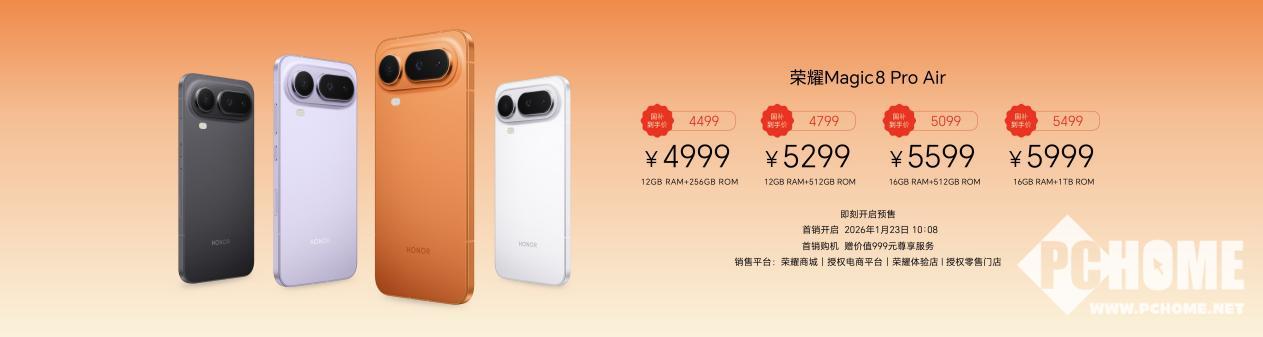荣耀Magic8 Pro Air提供了四个存储版本,12GB+256GB、12GB+512GB、16GB+512GB和16GB+1T版本售价分别为4999元、5299元、5599元和5999元,国补到手价分别为4499元、4799元、5099元和5499元。2026年1月23日10:08正式开售,首销购机赠价值999元尊享服务。