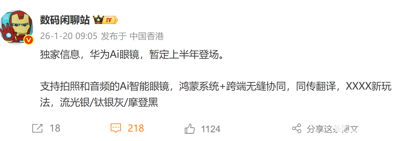 1月20号消息,根据博主@数码闲聊站曝光称华为AI眼镜将会在今年上半年正式登场,拥有全场景交互能力与创新功能。
