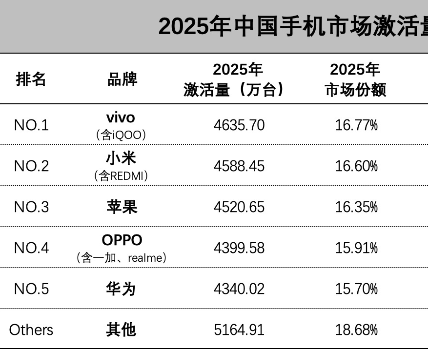据数码闲聊站提供的数据显示,2025年国内手机激活量位列前三的是vivo、小米和苹果。vivo继续蝉联第一,激活量同比略降;小米力压苹果升至第二,小米17系列的爆火功不可没;苹果属于一年不开张,开张吃一年。