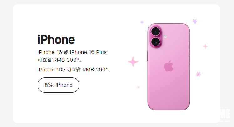 苹果中国官网正式上线新春限时优惠活动,iPhone 16及iPhone 16 Plus直降300元,iPhone 16e降价200元,最新的iPhone 17系列并不参与此次活动。