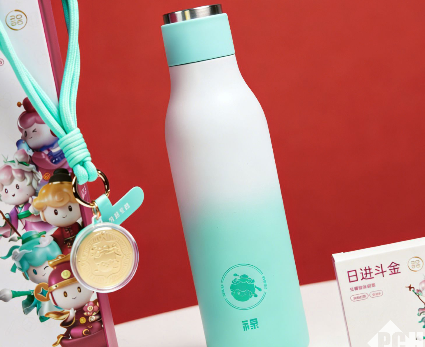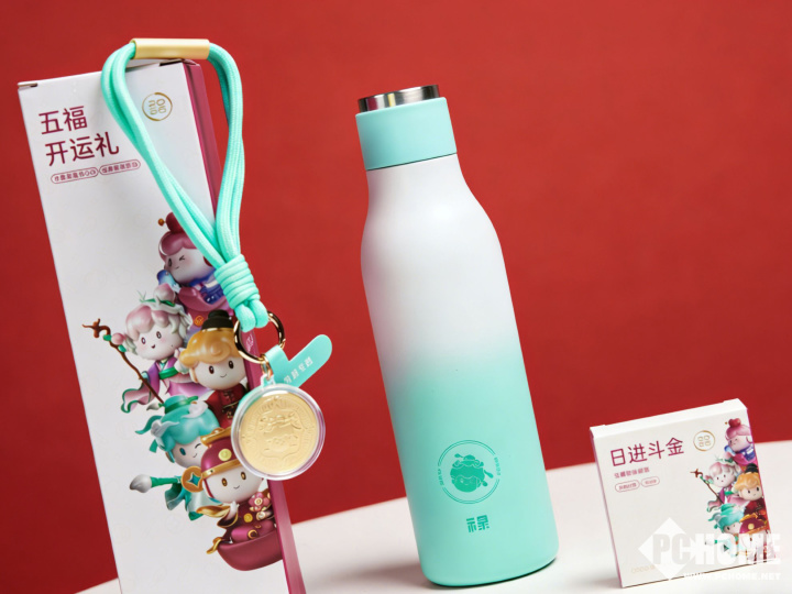 我们收到的这个盲盒,是以禄为主题的礼盒,保温杯与挂绳是青绿色的主色调。