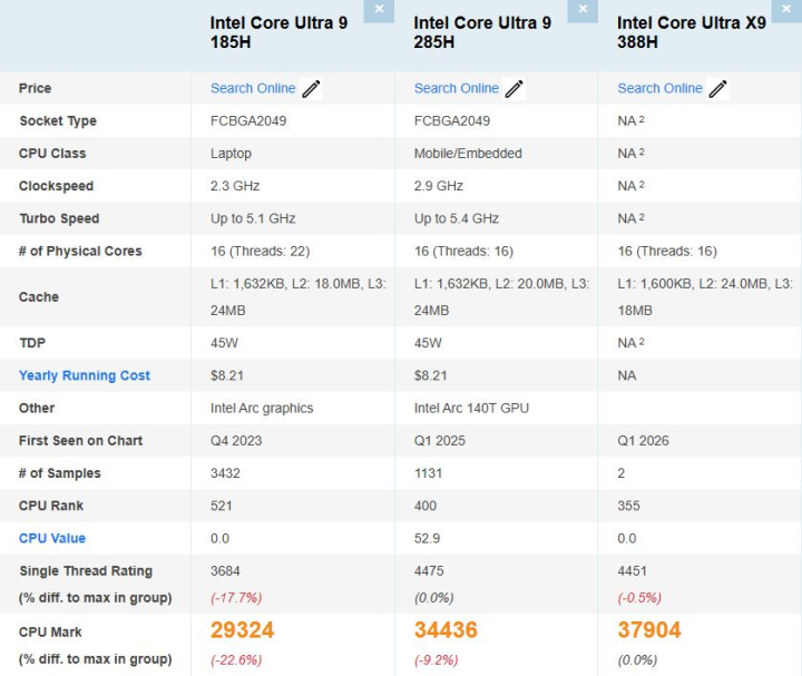 目前该处理器在PassMark中有两项跑分记录。从数据来看,其核心数量、单核性能参数与酷睿 Ultra 9 285H基本持平。但酷睿 Ultra X9 388H的单核跑分成绩略高于前代,多线程性能更是实现了17%的大幅提升。同时依托Xe3架构,其核芯显卡的表现也实现了质的飞跃。