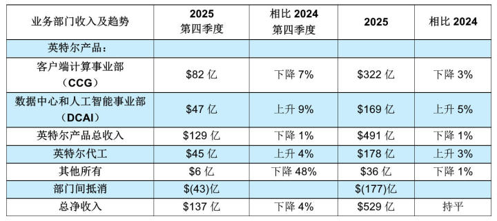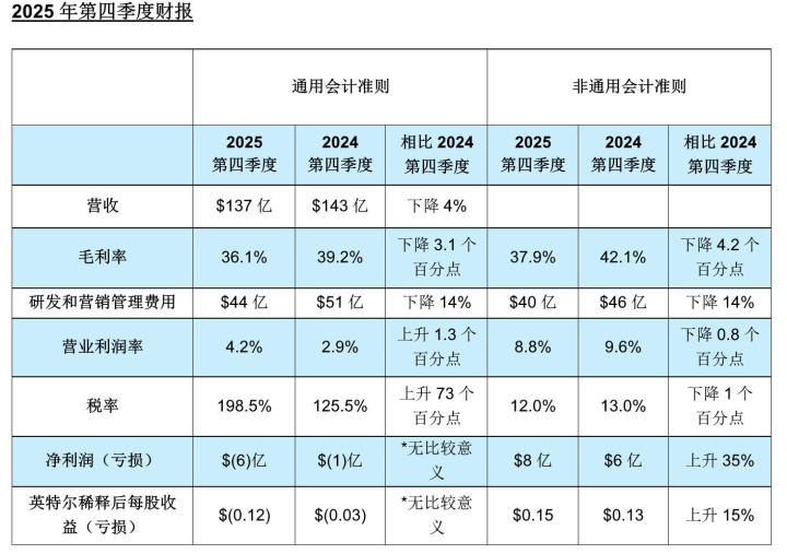 英特尔发布2025年第四季度及全年财报。2025年第四季度实现营收137亿美元,同比下降4%;全年营收为529亿美元,与2024年基本持平。