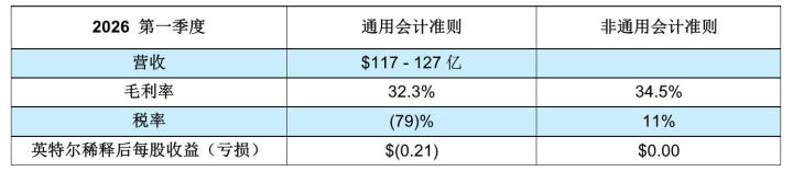 在前瞻指引方面,英特尔预计2026年第一季度营收为117亿至127亿美元;GAAP口径下每股收益为-0.21美元,Non-GAAP每股收益预计为0.00美元。公司同时给出了第一季度GAAP毛利率32.3%、Non-GAAP毛利率34.5%的指引区间。