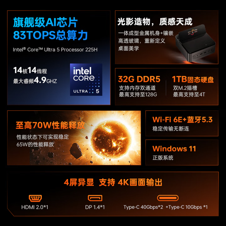机械师GTS迷你主机凭借顶部可升降智慧屏与四风扇散热系统脱颖而出,成为市场焦点。近期新增Ultra 5入门配置,叠加国补后仅4844.15元。
