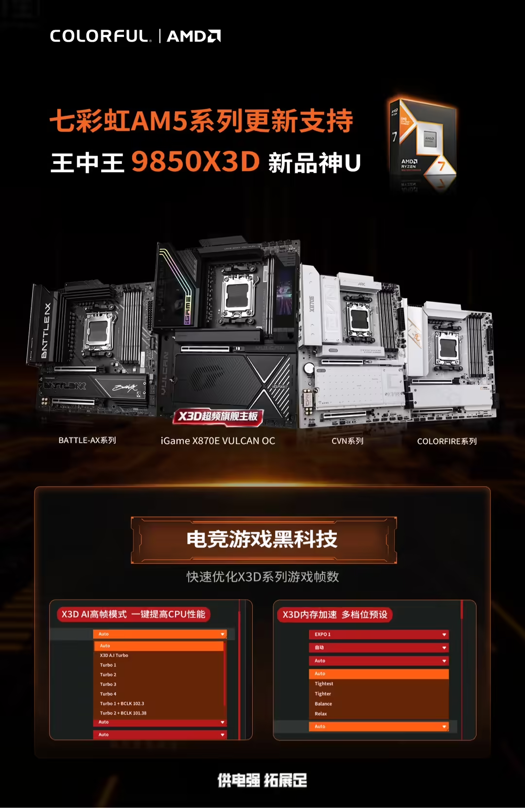 七彩虹正式官宣,旗下全系列AM5接口主板(含X870E、B850等主力型号)已完成BIOS固件更新,全面支持AMD新一代旗舰游戏处理器锐龙7 9850X3D。