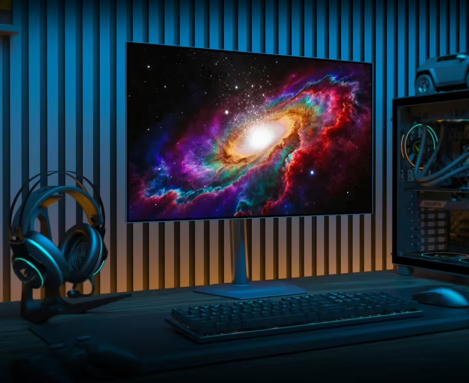 配置方面,2560×1440分辨率搭配240Hz原生刷新率,辅以0.03ms灰阶响应时间,高速游戏无拖影。开启UltraClear黑帧插入技术后,动态模糊大幅降低,操作跟手性拉满。1300nits峰值亮度可压制强光,275nits全屏亮度适配多场景。面板覆盖99% DCI-P3色域,支持10-bit色深,Delta E≤2的专业色准搭配Pantone认证,无需校色即可胜任剪辑、修图工作。多色域模式可灵活切换,兼顾游戏与创作需求。