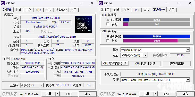 在CPU-Z的测试中,酷睿Ultra X9 388H多线程得分高达9845,与Meteor Lake中基础功耗为28瓦的Ultra 7 155H相比,单线程性能提升9%,多线程提升22.2%,性能提升还是非常可观的,能效比非常出色。