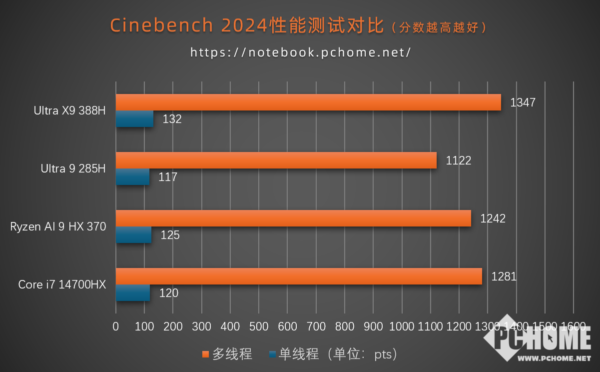 在CINEBENCH 2024版本的测试中,10分钟循环test中,Ultra X9 388H取得了单核132 pts,多核1347 pts的成绩,与第二代酷睿Ultra 9 285H相比,单核性能提升13%,多核性能提升20%。甚至与基础功耗55瓦的i7 14700HX相比,多核性能也有5%以上的超出。以更低的功耗水平,实现了更强的代际性能提升,Intel 18A的威力初见端倪。