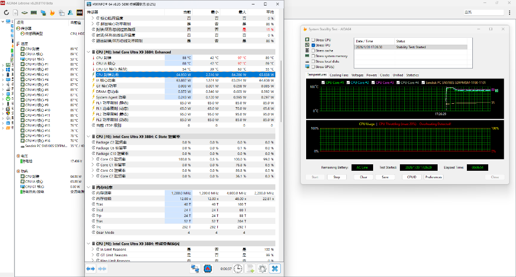 值得一提的是,联想小新Pro 16GT AI元启版采用了增强的散热系统,因此这颗Ultra X9 388H的性能释放更加激进,在AIDA64的烤机测试中,CPU的平均输出功耗高达65瓦,稳定达到PL1功耗上限,也说明这颗U有着巨大的TDP调校潜力,能发挥多少性能与OEM的设计水平紧密相关。