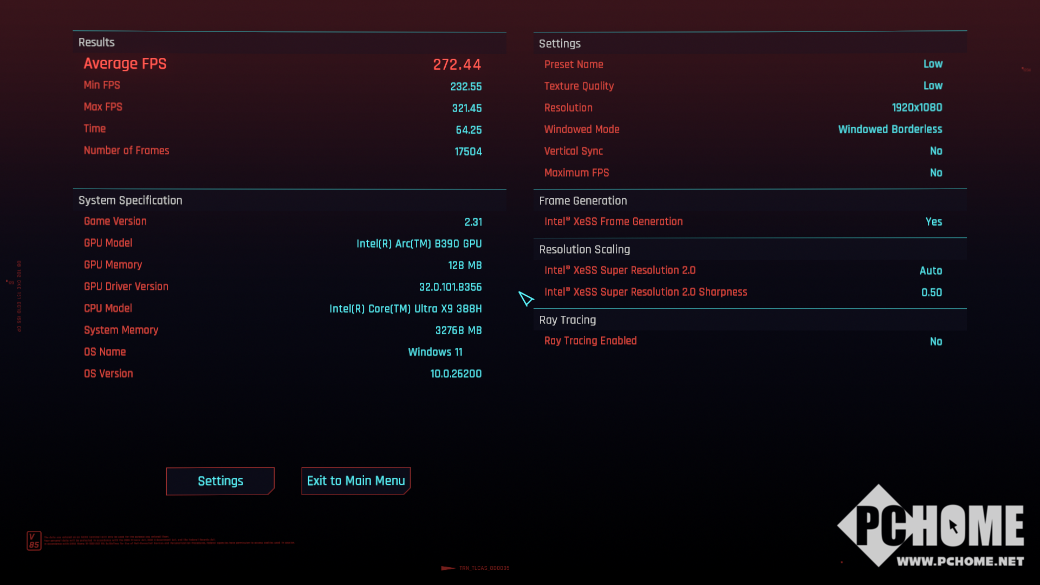 实测在低画质、FHD分辨率的设定下,《赛博朋克2077》游戏的平均帧率高达272帧!你很难想象,这是一台15mm左右厚度的集显轻薄本达成的成绩!