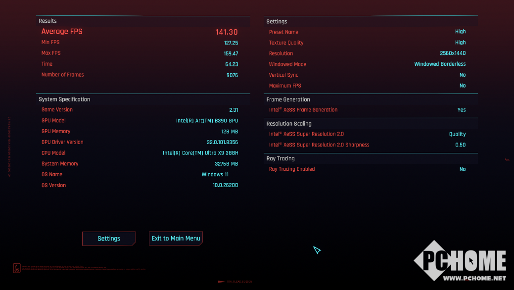 甚至,我们调整到高画质预设,2560*1440分辨率的设定下,依然有着141FPS的平均帧率表现,这个性能水平足以让你在出差间隙畅游夜之城!