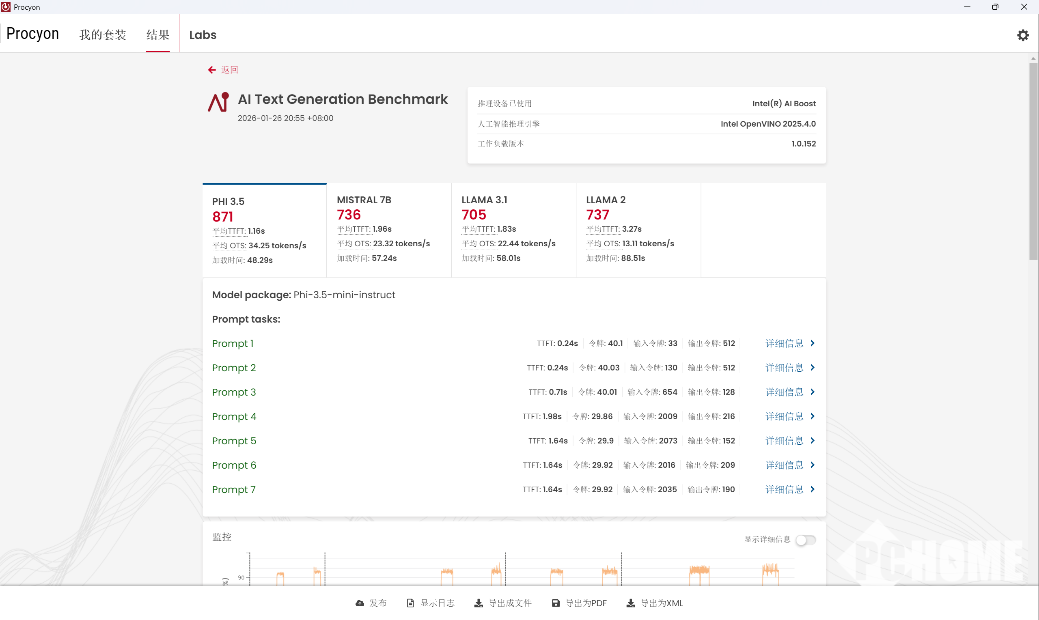 UL Procyon中的AI Text Generation测试中,四个本地LLM模型PHI 3.5、MISTRAL 7B、LLAMA 3.1、LLAMA 2的平均加载时间低至48.29秒,首Token延迟(TTFT)最低仅有1.16秒,PHI模型平均OTS达到每秒34.25 Tokens。