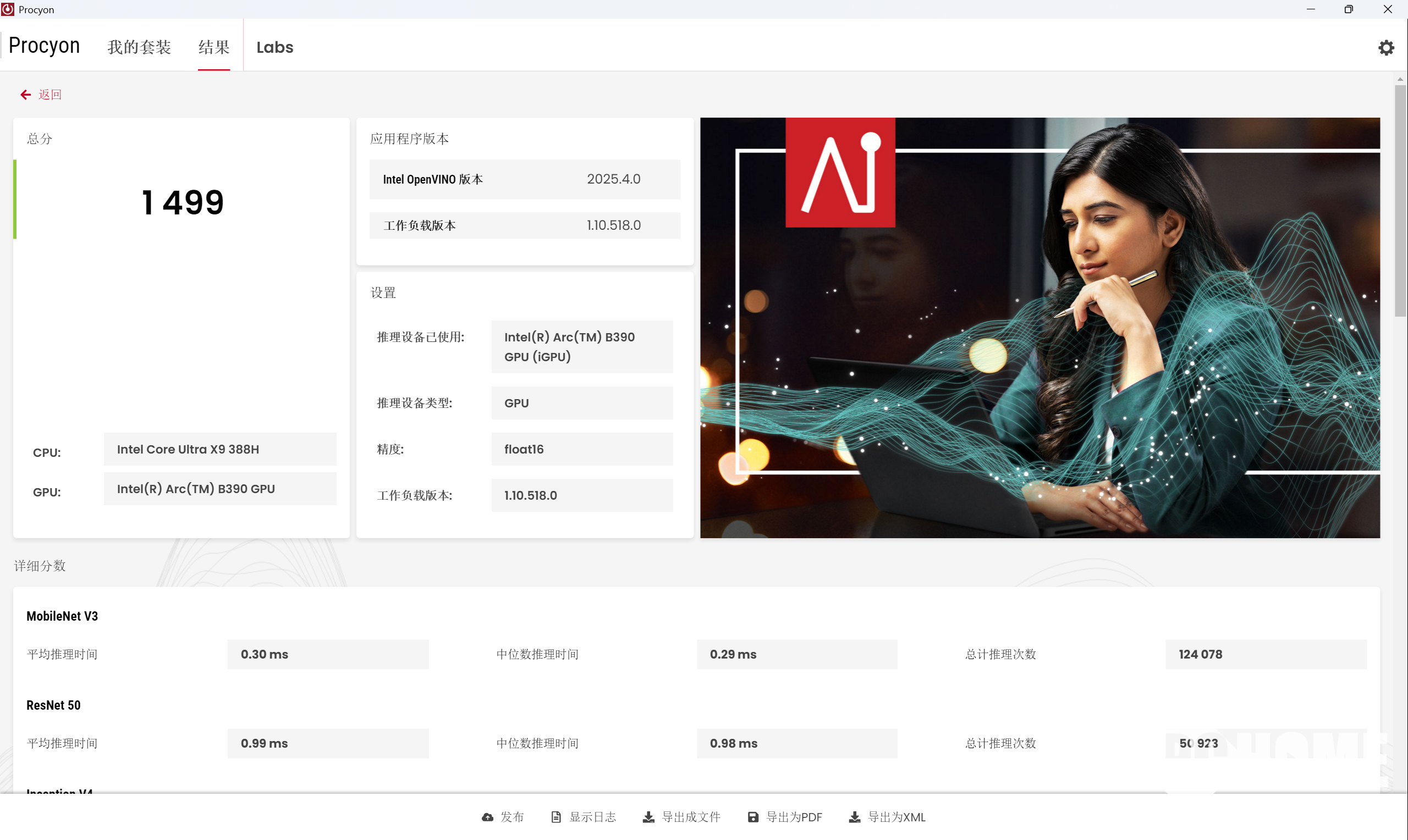 UL Procyon中的AI 性能测试中,使用OpenVINO接口的独立NPU取得了1264分的成绩,与1499分的B390 GPU共同展现了出色的FLOAT16计算性能。为本地大模型的运行提供了强大基础。