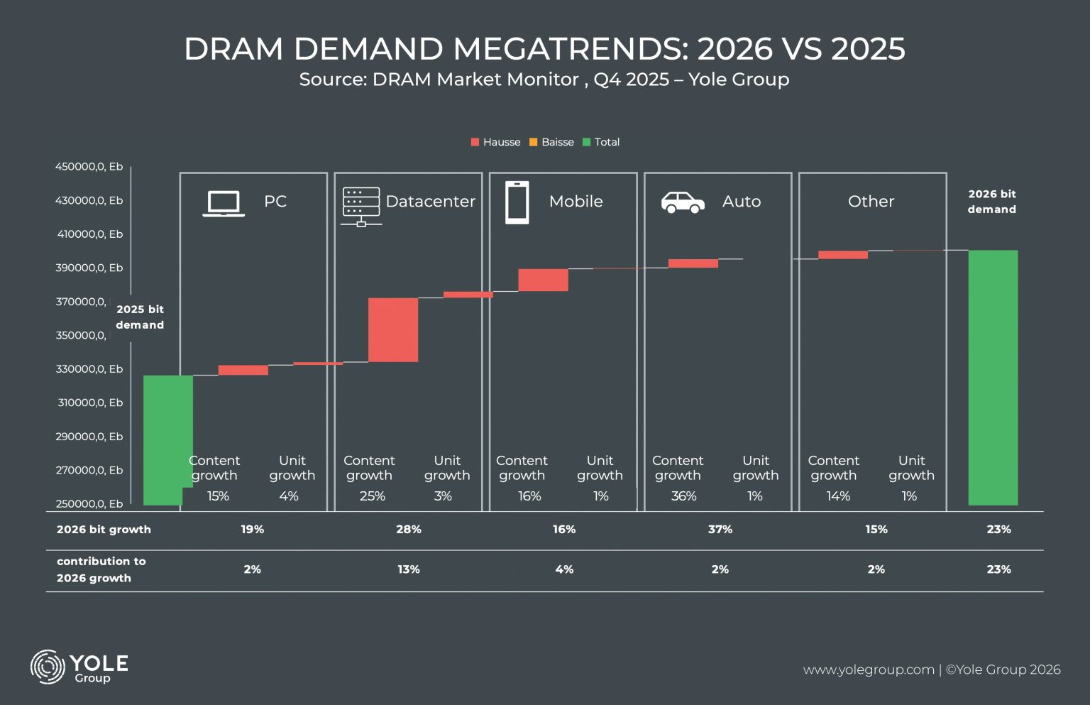 市场研究机构Yole发布的最新报告显示,2026年全球DRAM内存按容量(bit)计算的需求,将同比增长23%。这波增长中,数据中心领域表现最为亮眼,需求增幅冲到了28%,仅凭这一板块就贡献了整体增长的13%,超过半数,直接撑起了DRAM市场增量的半壁江山,妥妥的核心驱动力。