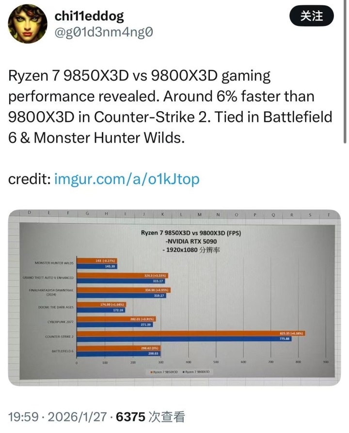 根据外媒博主@g01d3nm4ng0昨日发布的推文,分享了AMD新款处理器Ryzen 9 850X3D的7款游戏性能测试数据。
