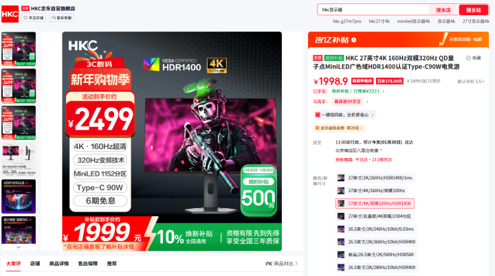 在推荐的四款中HKC G27M7Pro是唯一不足2000元的机型,HKC G27M7Pro用国补后1998.9元的价格,把“卷”这个字刻进了DNA。这款显示器搭载QD-MiniLED背光面板,拥有4K 160Hz原生刷新率,同时也支持1080P下320Hz双模输出,并在参数上最为亮眼的是其拥有HDR1400认证与90W Type-C反向充电,让这台机器在参数表上完全找不到短板。