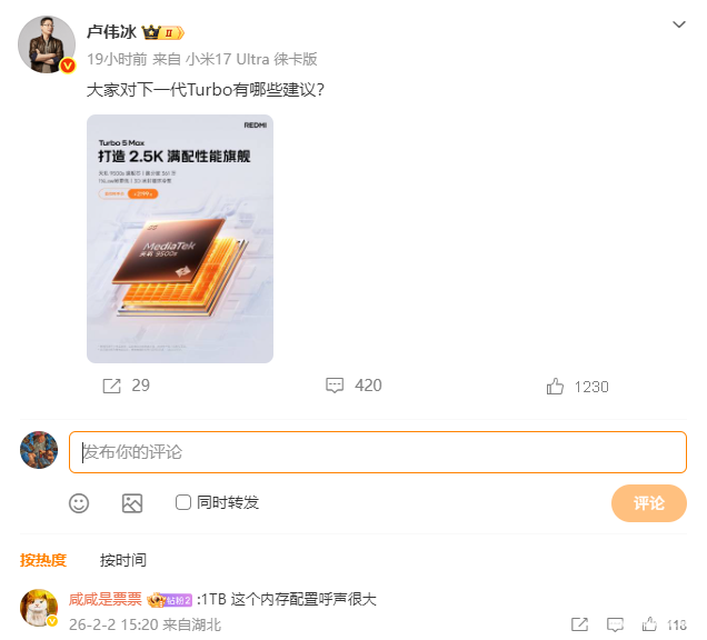 在这条微博中,不少米粉都对卢总进行了隔空喊话,而收获呼声最高的,就是希望下一代Turbo新品能够提供1TB大存储。