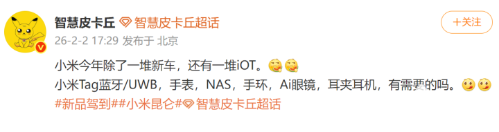2月3号消息,据博主@智慧皮卡丘爆料称小米在今年即将发布一系列IOT新品,包括Tag蓝牙追踪器、智能手表、手环、AI眼镜、NAS、耳夹耳机等产品。