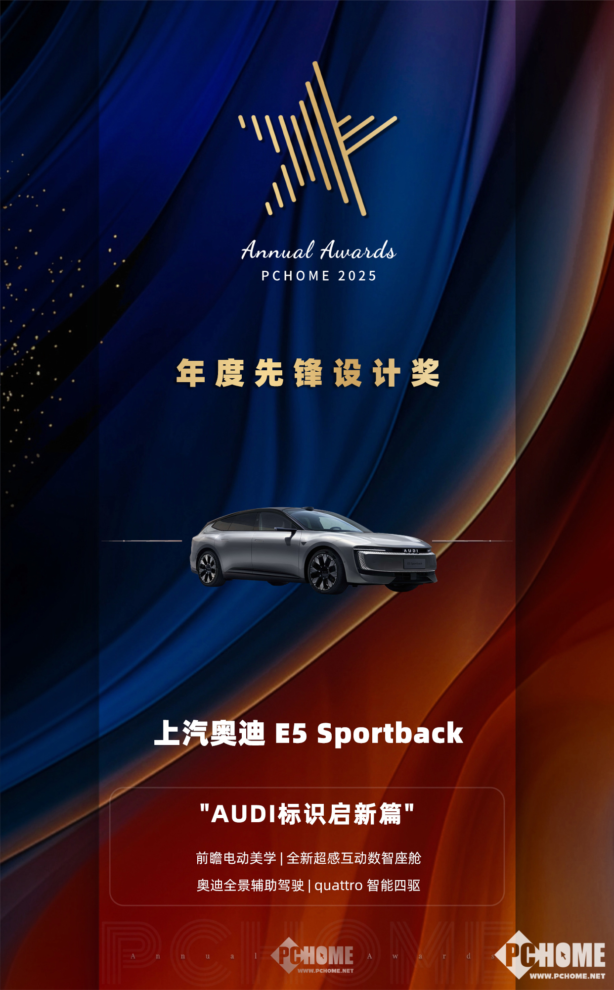 PChome 2025年度卓越产品评选中,上汽奥迪 E5 Sportback凭借其在电动化语境下的设计创新与品牌表达能力,荣获“年度先锋设计奖”。