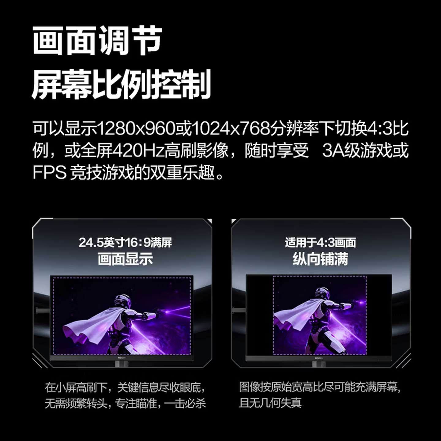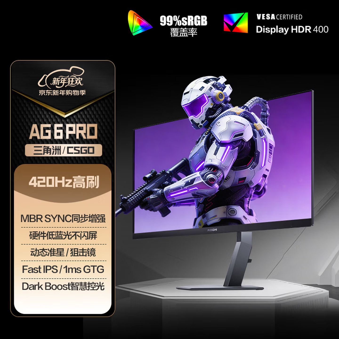 这款显示器采用Fast IPS面板,支持1920×1080分辨率,刷新率达原生420Hz,响应时间低至1ms GtG,有效减少画面拖影。同时在HDR模式峰值亮度可达450尼特,静态对比度1000:1,覆盖99% sRGB和91% DCI-P3色域,出厂校色ΔE&<2。还有可随心调配自己喜欢的色彩色调,6种色调x6种饱和度,无限色彩组合随心调节,打造你的专属色彩方案。