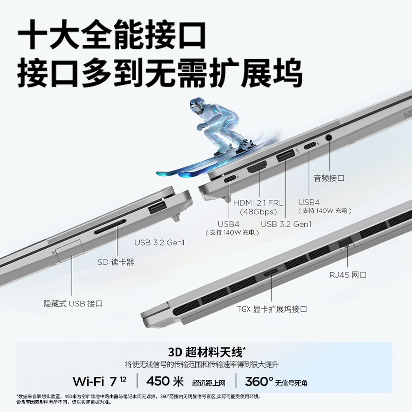 存储配置上,这款机型同样标配TLC颗粒PCIe 4.0固态硬盘,额外预留一个PCIe 4.0硬盘扩展位,最高可扩容至8TB;内置99.9Wh大容量电池,标配140W便携氮化镓充电器,其余外围配置与14 +基本持平。