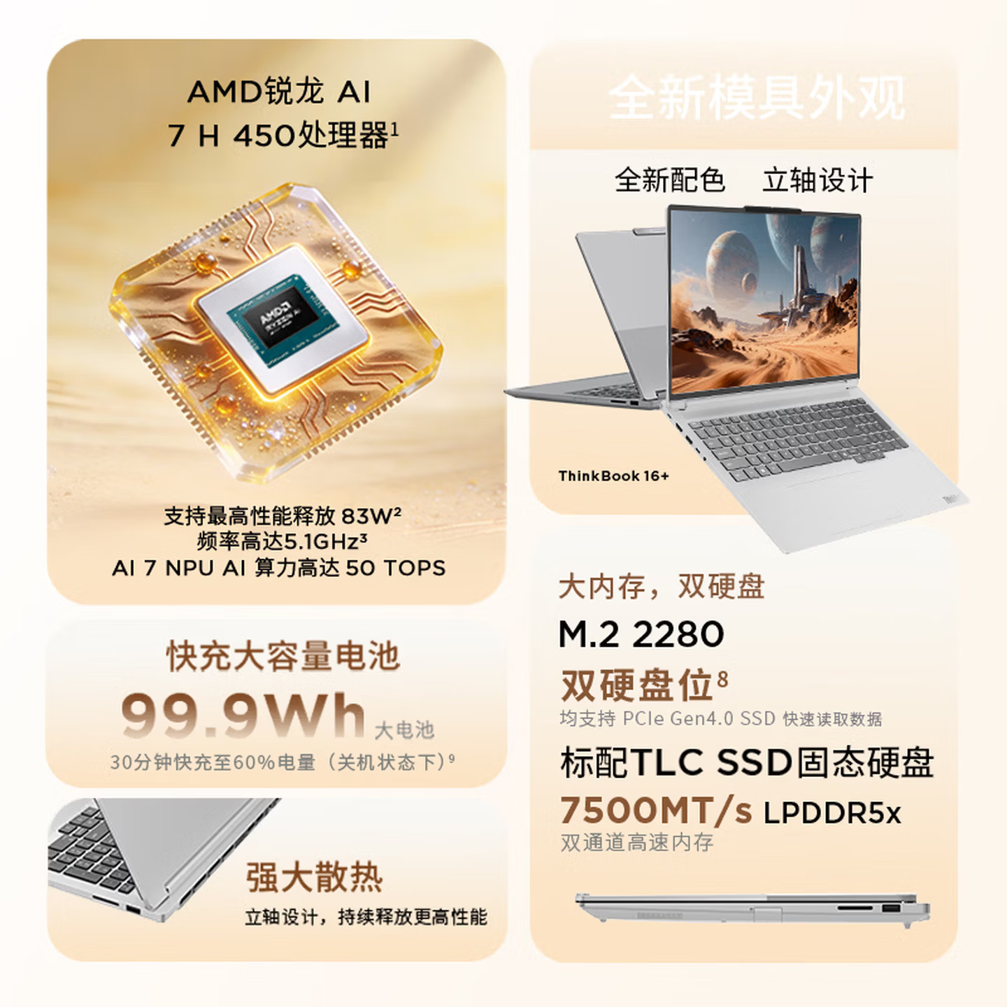 目前联想ThinkBook 14+/16+ 2026款锐龙版在售机型主要搭载R7 H255/H260处理器,而今日AI 7 H450处理器版本也正式在电商平台上线。