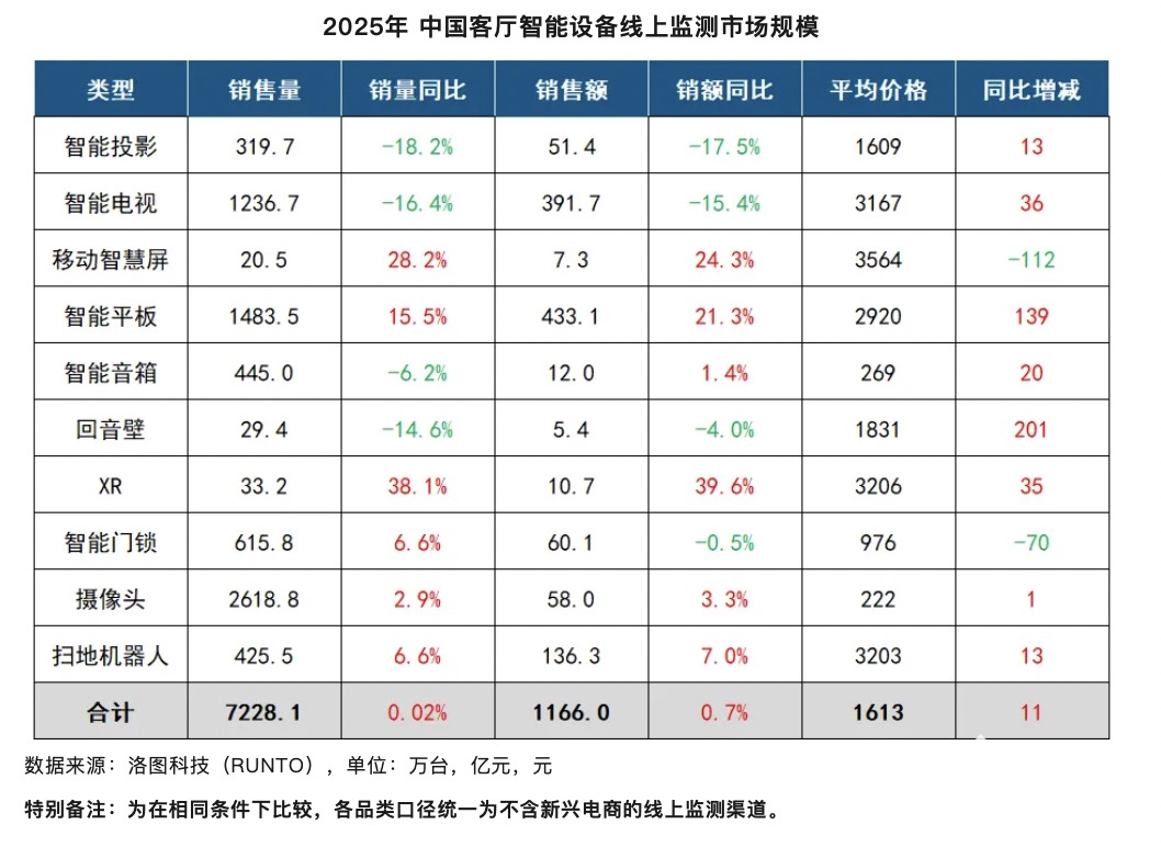 2025年中国客厅智能设备的线上监测市场(不含拼抖快等新兴电商)总零售量为7228万台,同比基本持平;总零售额为1166亿元,同比微增0.7%。