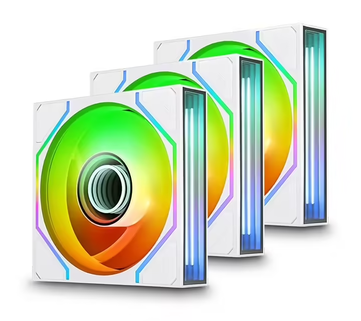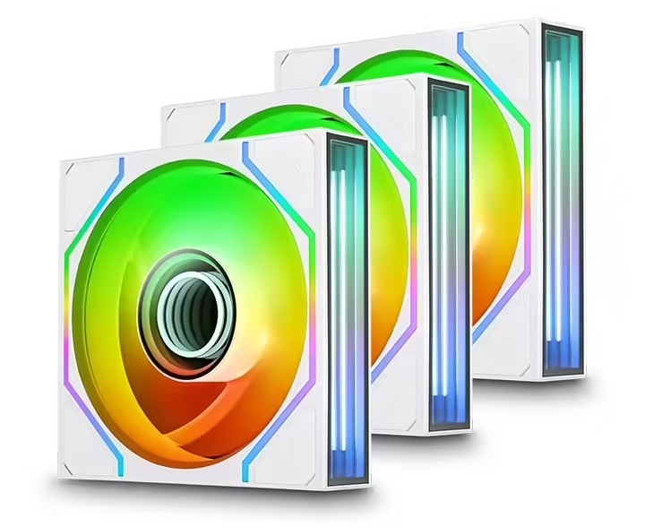 这款风扇主要核心亮点集中在创新设计上:双重无限镜灯效极具辨识度,在风扇轴心与上下两侧均设置ARGB灯光区域,固定白色内圈与可自定义彩色外圈叠加,呈现出层次丰富的立体光影效果。