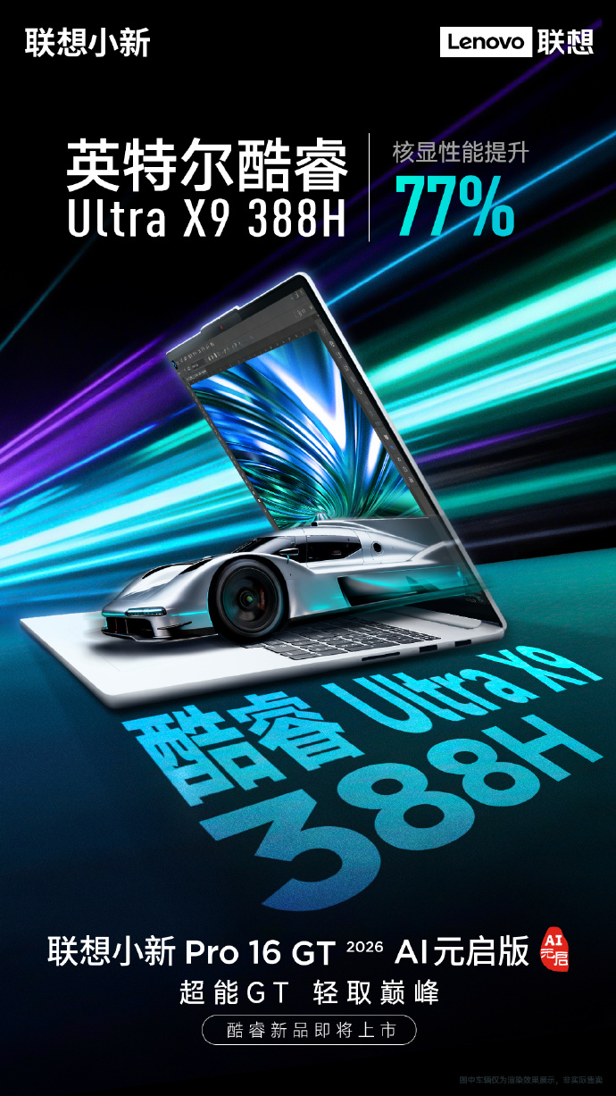 联想小新Pro 16 GT AI元启版 2026酷睿款将于2026年3月正式上市,主打高性能全能本定位,搭载英特尔第三代酷睿Ultra处理器,核显性能提升高达77%,配合99.9Wh大电池与全新散热系统,兼顾强劲性能与长效续航,酷睿款首批机型预装“天禧个人超级智能体3.5”AI助手。
