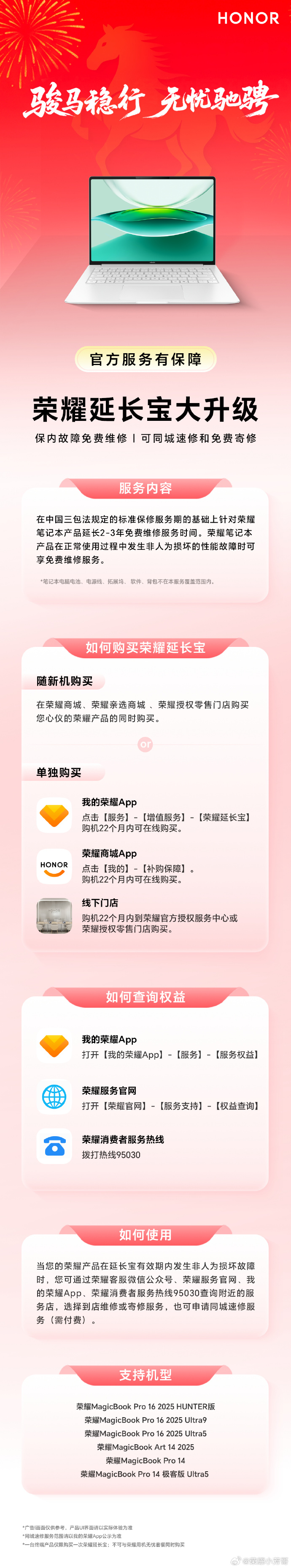 2026年新春期间,荣耀官方宣布重大服务升级,针对旗下六款热门笔记本机型推出延长宝服务优化,将原有的1年免费维修期延长至2-3年,提升用户售后保障体验。