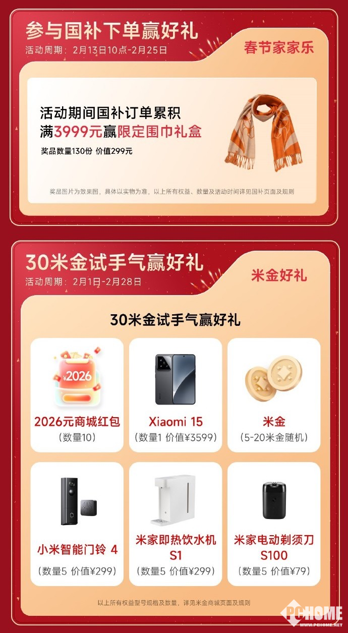 在小米科技年货节期间,可以30米金试手气可赢好礼,包括2026元商城红包、小米15、小米智能门铃4、米家即热饮水机S1等热门产品。