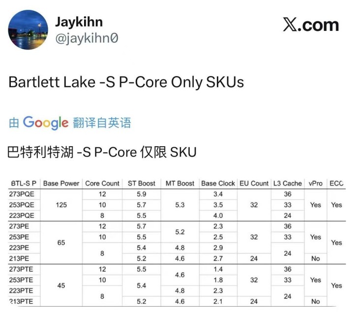 根据外媒博主@@jaykihn0的爆料,英特尔Bartlett Lake-S系列处理器阵容曝光,采用罕见的纯性能核设计,但其定位明确指向工业与边缘计算领域,属于酷睿200E系列;虽沿用LGA-1700接口,但主板厂商未提供BIOS支持,消费级平台无法使用,仅可能通过第三方渠道流入DIY市场。