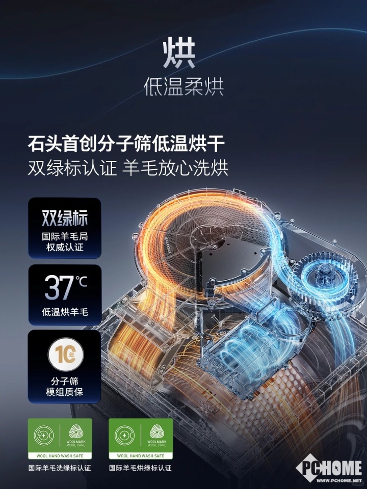该技术通过独特的双风路与除湿系统,实现了低温高效烘干。在专为娇嫩面料设计的羊毛烘干程序下,筒内温度可低至37°C,在彻底烘干的同时,极致呵护纤维结构,保持衣物蓬松柔软、富有弹性。此项技术已荣获国际羊毛局烘干绿标认证(最高等级),真正让用户对高端衣物的烘干安心无忧,实现从洗衣机取出即可直接穿着的便捷体验。