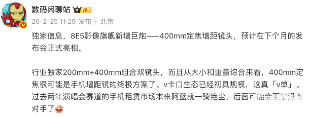 相关行业爆料人士指出,X300 Ultra将全球首发索尼2亿像素LYT-901传感器,并配备一颗2亿像素潜望式长焦镜头,以及行业领先的超广角镜头,影像能力实现全方位跃升。此外,新机还将带来行业独有的200mm+400mm双定焦增距镜头组合,其中400mm焦段或将成为手机增距摄影的终极解决方案。在“双2亿”与“双定焦增距镜”的强强联合下,X300 Ultra有望在演唱会拍摄赛道上实现新的突破,进一步巩固其“演唱会神器”的地位。