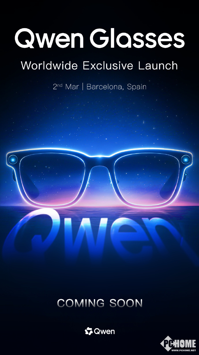 PChome 2月27号消息,MWC2026即将举办,夸克AI眼镜官方宣布将在MWC2026上全球首发千问AI眼镜。