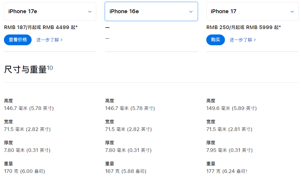 PChome了解到,iPhone 17e在外观设计上没有丝毫变化,从苹果官网提供的数据来看,其外观尺寸为146.7mm*71.5mm*7.8mm,与iPhone 16e完全一致,重量170克,比前代重了3克。