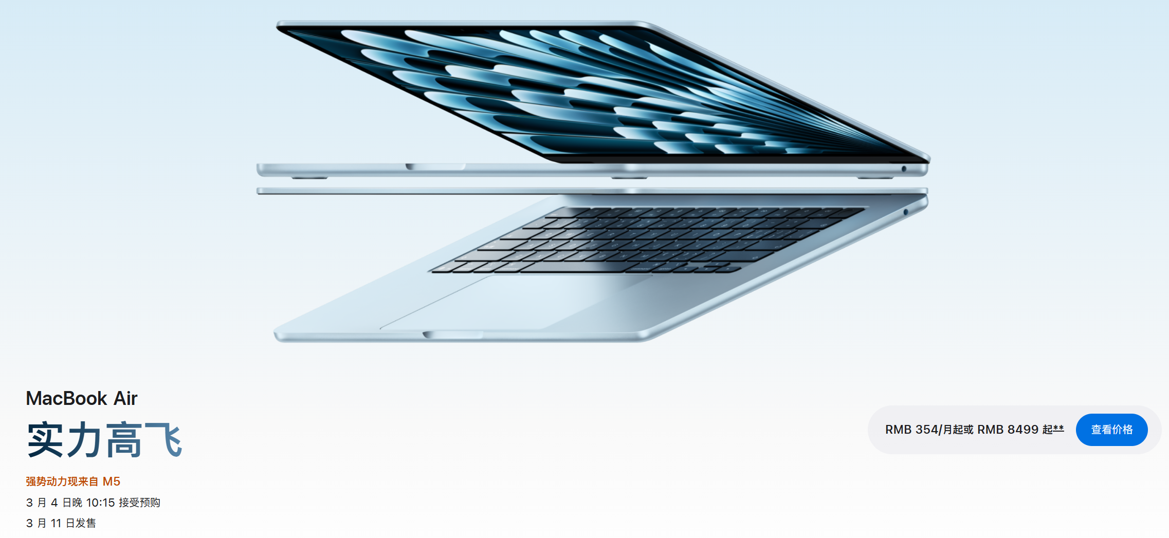 PChome3月4日消息,苹果昨晚正式推出搭载M5芯片的全新MacBook Air,提供13英寸与15英寸双尺寸版本,全面升级,起售价8499元。将于3月4日22:15开放预购,3月11日正式发货。