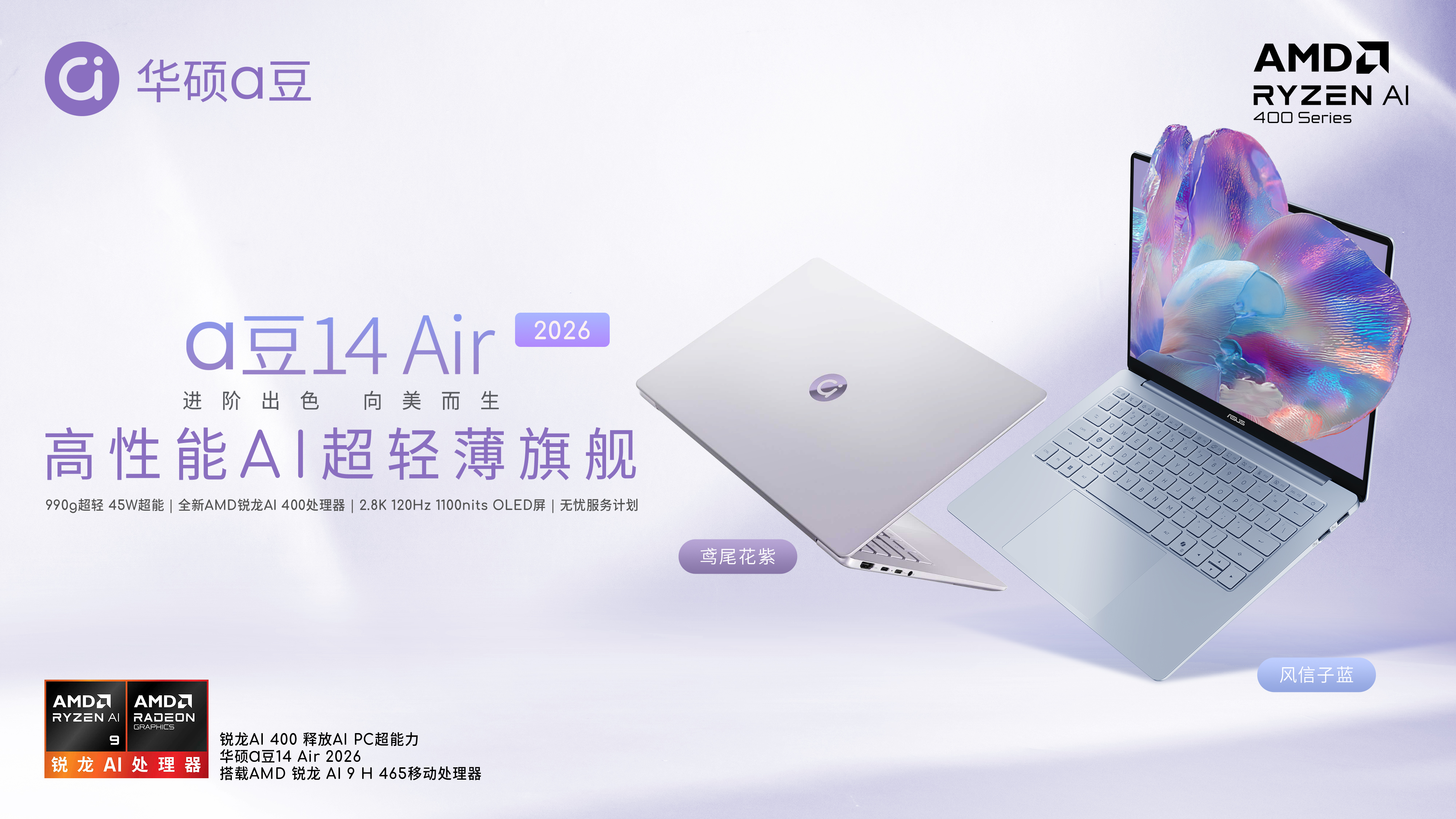 新春开工季,各位职场人纷纷重返 “职场战地”,开启新一年的工作安排。一款趁手的办公笔记本不仅是提升效率的重要工具,更是陪伴日常通勤、跨场景办公的重要伙伴。对于年轻职场人而言,普通笔记本已难以满足其对生产力工具的需求,理想设备不仅要追求强劲性能,更要兼顾颜值、便携与智能体验。华硕a豆14 Air 2026重磅升级,在990g超轻薄机身下做到了45W的卓越性能释放;外观上更是以自然为灵感,焕新推出风信子蓝、鸢尾花紫两款清新配色,金属材质颜值拉满;搭配2.8K 120Hz 1100nits的OLED华硕好屏。以硬核性能、轻薄便携、华硕好屏等多项核心优势,成为开工季办公装备焕新的品质之选。