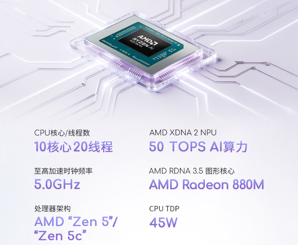 轻薄机身之下,性能依旧不打折扣。华硕a豆14 Air 2026升级搭载AMD锐龙AI9 H 465处理器,采用AMD全新Zen 5/Zen 5c架构,拥有10核20线程的高规格,单核加速频率可达5.0GHz,为开工之后的高强度办公提供硬核性能支撑;搭配华硕冰锋散热系统,内吹风道设计,配备双风扇、双热管,可实现至高45W的稳定性能释放,打破轻薄本性能差、散热弱的刻板印象,即使同时打开数十个网页也能流畅运行,不会出现程序卡死等问题,轻松胜任多任务处理、文档编辑、数据整理等高频办公内容;集成AMD Radeon 880M核显,视频和图形渲染效率显著提升;XDNA2 NPU带来至高50TOPS NPU AI算力,AI任务处理速度飙升,高能高效一步到位;标配32GB LPDDR5X超高频内存+1TB PCIe 4.0的满配组合,多应用切换更丝滑,文件拷贝、素材导入更高效,海量工作文件随心存储,办公资料轻松收纳,工作丝滑到底;并配置双M.2 SSD插槽预留充足扩容空间,长效适配工作需求,存储全程无负担。