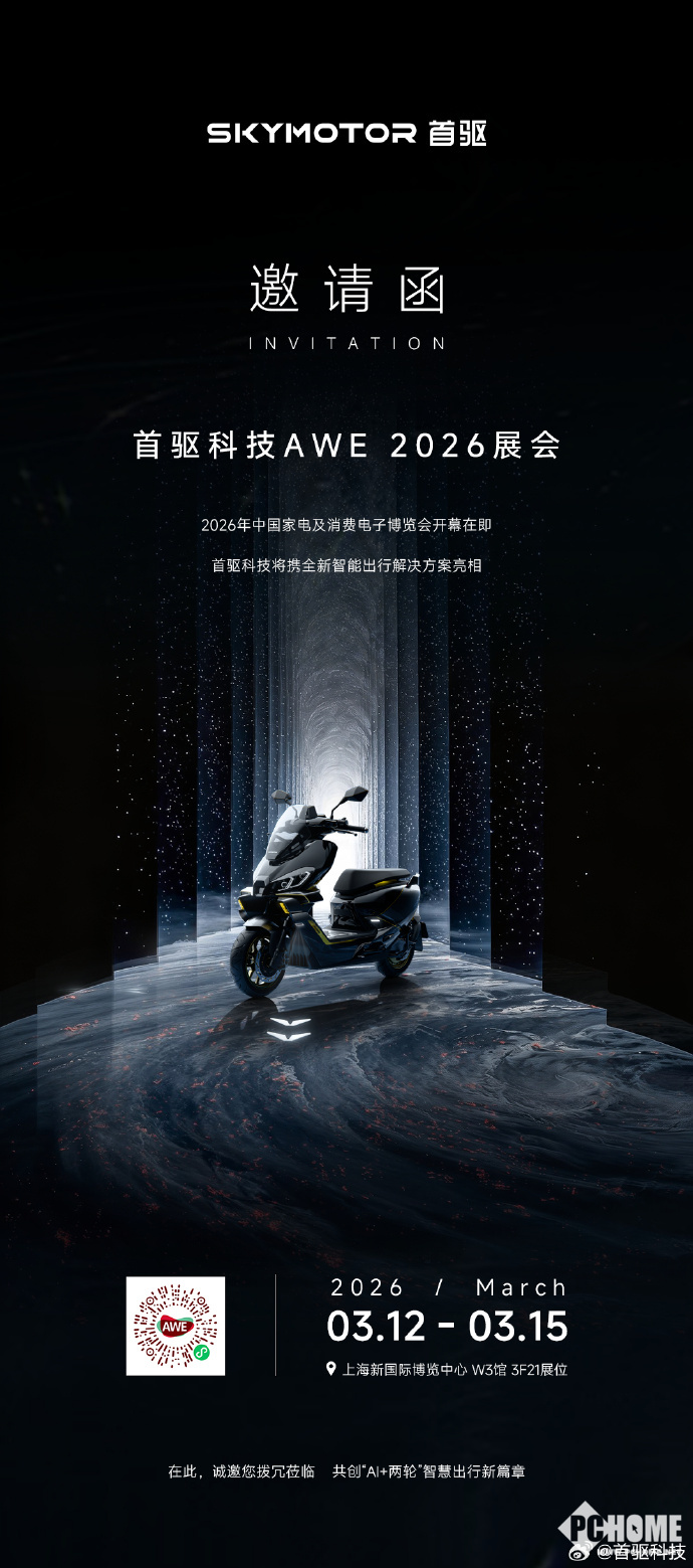 PChome 3月5日消息,首驱科技(Sky Motor)确定将参展AWE 2026,将以AI自适应技术重构出行逻辑为核心主题,携全系列AI智能电动车登场,将汽车级AI技术全面下放至两轮出行领域,打造集智能、安全、体验于一体的全场景出行解决方案。