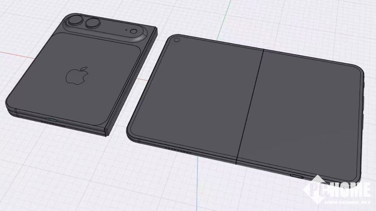 PChome了解到,新流出的设计图,据称源自手机壳制造厂商拿到的图纸。图片展示了该机在折叠和展开时的两种形态,展开状态下的iPhone Fold外观接近iPad mini,提供了一个挖孔镜头,位于展开时的左上角区域。
