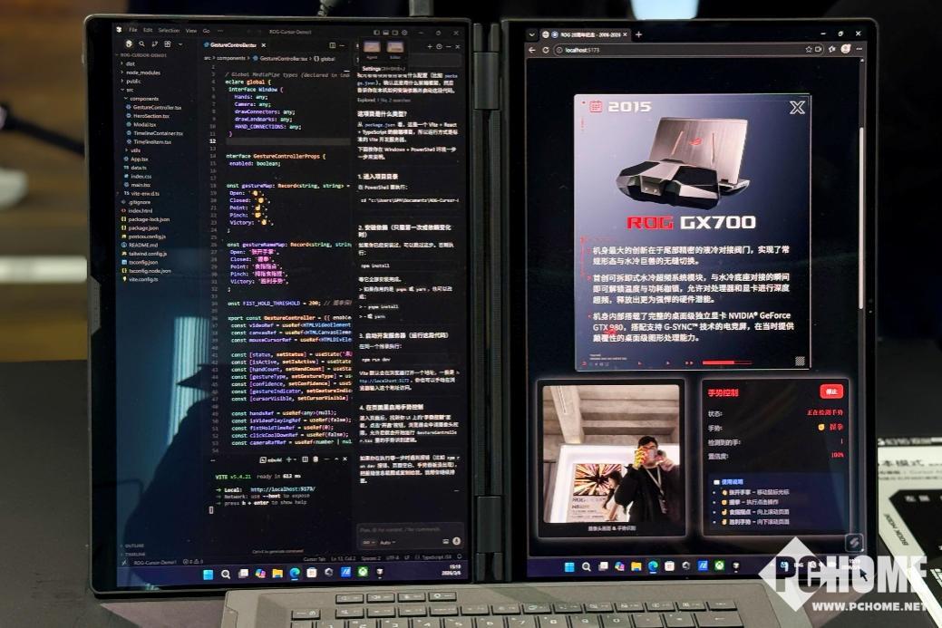 作为一台双屏电脑,ROG幻16 双屏的屏幕规格很是亮眼,采用了两块完全一致的16英寸ROG星云原画屏,双屏组合可提供等效超过21英寸的广阔视野,使用户在移动设备上即可获得接近桌面工作站级别的工作空间。两块屏幕均支持触控操作,能够在内容创作、视频剪辑、多窗口办公以及程序开发等场景中显著提升多任务处理效率。